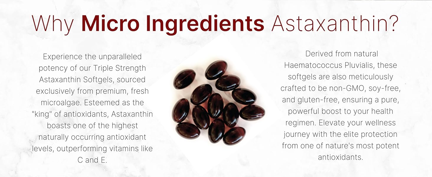 Micro Ingredients offers max strength Astaxanthin softgels, offering a high potency of 12mg natural astaxanthin per serving. Each one-a-day softgel provides up to a 120-day supply.